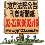 以多年刊登報業報紙廣告經驗,專營台灣各大報紙分類廣告登報服務。專業代理全國各大報分類廣告,中國時報、聯合報、自由時報、蘋果。href="http://22608602.web66.com.tw/web/SG?pageID=33312&_fcmID=2716336">公告報紙刊登全國版法院公示催告 報紙第一次拍賣 第二次拍賣公告 第三次拍賣廣告 報紙減價特別拍賣公告 支票遺失刊登 股票遺失公告 本票裁定 宣告死亡登報 限定繼承公告 夫妻財產制公告 離婚事件 法院簡易庭 民事裁定 法院民事判決 公示送達登報。無論您在南部地區、中部地區或北部地區全省各縣市皆可服務,免費排版 免費打稿,目前配合的律師事務所、會計師事務所、地政士及派報社、書局、文具店於全省各縣市約有數百家。各類登報公告業務歡迎相關行業長期配合,亦歡迎個人或公司,E-MAIL或撥服務專線委刊廣告。