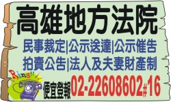 法院公告刊登網站-高雄市地方法院拍賣登報法院拍賣房屋-第一、二、三次法拍屋公告、特別拍賣、特別變賣程序後之減價拍賣刊登報紙及台南/新竹/嘉義/台北/板橋/台中/高雄/士林/桃園/彰化地方法院登報公告每字不到一元。
