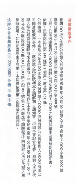 依據:民事訴訟法第149條第1項第1款及第151條公告事項:一.本案是00年度OO字第000號聲請人OOOO股份有限公司與相對人OOOO有限公司間清償債務事件。二.應送達之起訴狀繕本及調解期日通知書,現由本書記官保管,相對人法定代理人得於庭期前隨時前來本庭領取。三.通知書是通知本案於中華民國00年00月00日上午00時00分在本庭(設址: 嘉義OO路0段000號)第O法庭進行調解程序。四.相對人法定代理人應按時到場,如無正當理由不到場,本院得依職權一造辯論而為判決。