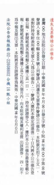 刊登報紙公示催告 公示催告登報 限定繼承 公示催告,公示催告聲請狀,公示催告登報,支票遺失不公示催告,票據掛失止付公示催告,公示催告程序,刊登報紙公示催告,公示催告刊登,聲請公示催告,公示催告範例,法院公示催告,何謂公示催告,公示催告申請書,公示催告期間,撤銷公示催告,公示催告範本,公示催告費用